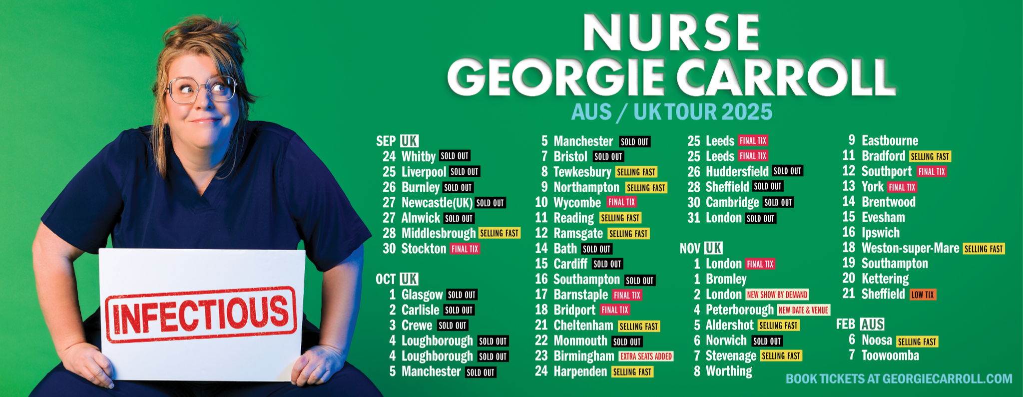 Georgie never knew where and when her comedy shows were, so she had her agents add her to her mailing list, she’s never missed a gig since. You can join the list too so you don’t miss out when she’s heading your way.